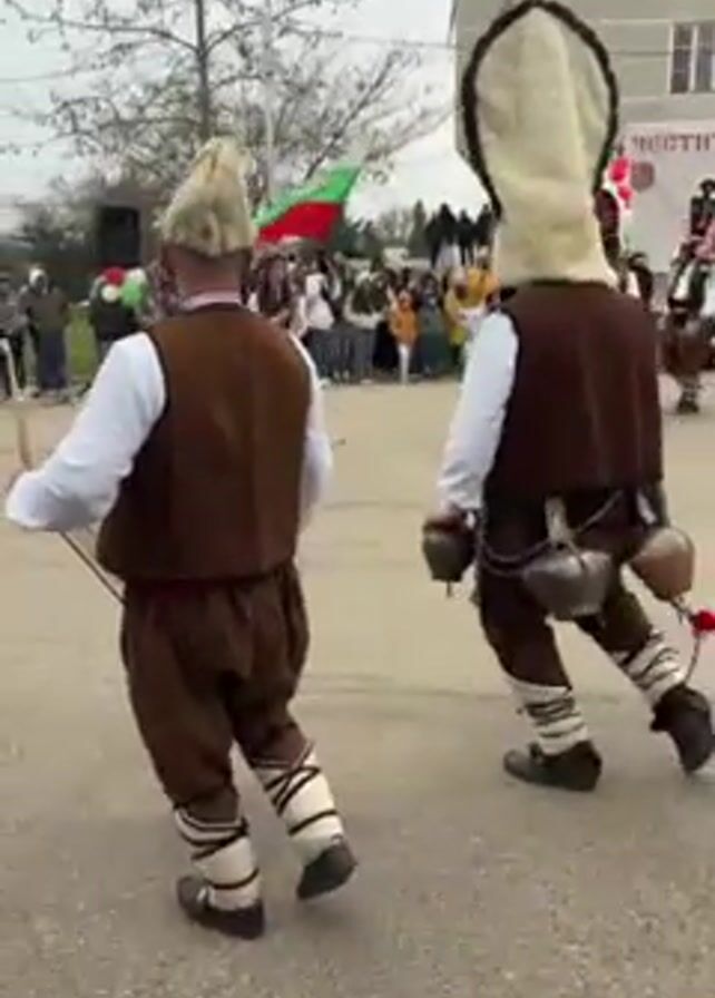 group of people participating in a Bulgarian traditional festival, likely Kukeri