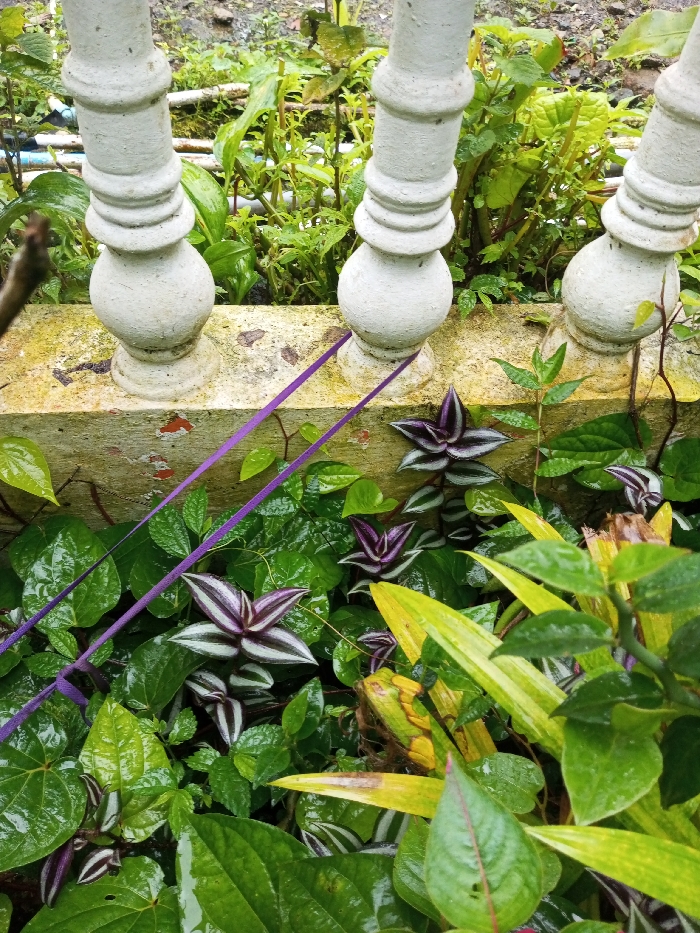 Three white, decorative balusters stand behind a textured, yellowed wall. Green foliage fills the foreground, interspersed with striking zebra plants displaying purple and silver striped leaves. A vibrant purple ribbon diagonally crosses the scene, adding a pop of color against the verdant backdrop. The foliage is wet with recent rain.