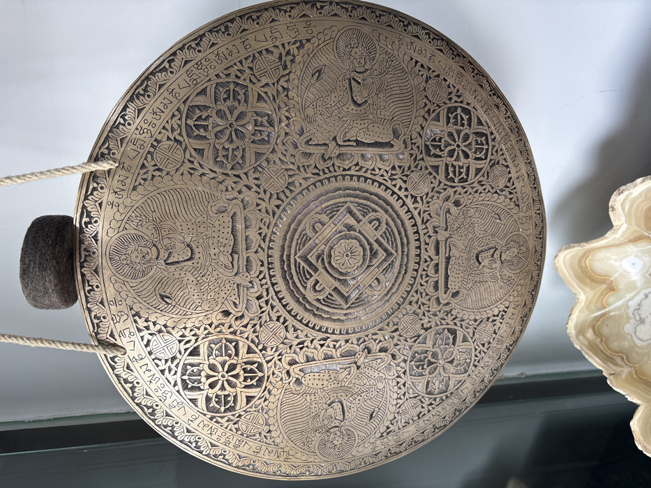 A detailed circular brass Tibetan singing bowl features intricate carvings
