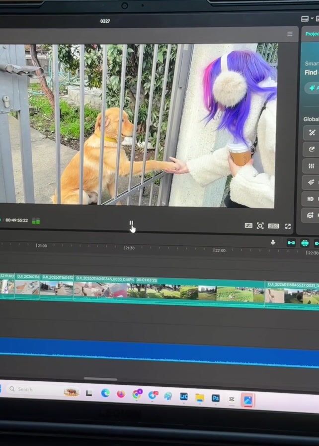 Here's a detailed description of the video: A laptop screen displays video editing software. The software shows a scene of a golden retriever puppy sitting behind a metal fence, reaching its paw out to touch the hand of a person with purple and pink hair who is kneeling on the other side of the fence. The person is holding a coffee cup. The background includes some greenery and parts of buildings. The video editing timeline is visible at the bottom of the screen, with several clips arranged sequentially.