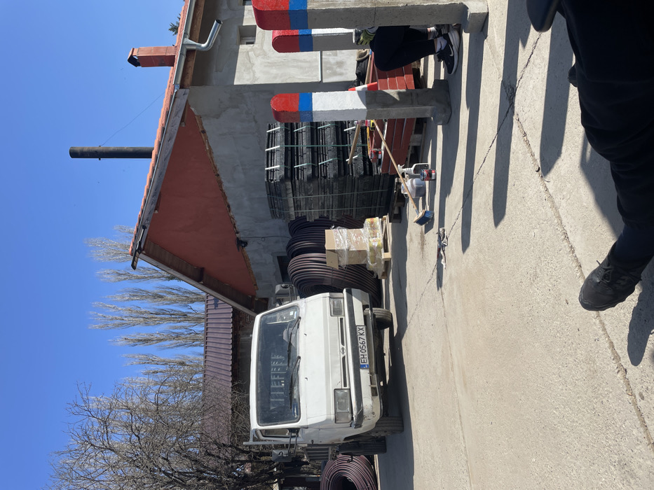 The image depicts an outdoor scene in Cherven Bryag, Bulgaria, under a clear blue sky. The ground is primarily a flat, light-colored concrete surface. In the left foreground, the lower legs and feet of an individual wearing black pants and black shoes are visible, extending forward with shadows cast to the right. To the right, another individual's lower body is partially visible behind a concrete post, wearing black pants and white-soled sneakers; this person appears to be seated or crouched. Prominently featured in the mid-ground are multiple upright concrete posts, painted with horizontal red, white, and blue bands. Near these posts, a blue broom, a white spray bottle, and several small cans (some open, containing paint) are scattered on the concrete. A piece of fabric or rag lies near the broom. A white Nissan flatbed truck with Bulgarian license plate EH 0567 KX is parked on the left side of the concrete area, facing the viewer. Behind the truck, large coils of dark material, likely piping, are stacked. Adjacent to the coils, a pallet wrapped in clear plastic film with unknown contents is visible. In the background, a single-story building with a light gray concrete exterior and a reddish-orange gable end is situated. This building features a dark red tiled roof, a metal gutter on the right, a tall black metal chimney, and a smaller red brick chimney. Against this building, a large stack of flat, dark rectangular objects, possibly mats or panels, secured with green straps, is present. Red-painted wooden planks or stakes are also visible near these stacked items. Behind the single-story building, part of a taller two-story building with a dark brown corrugated metal roof is visible. Several tall, bare deciduous trees stand against the horizon under the clear sky.