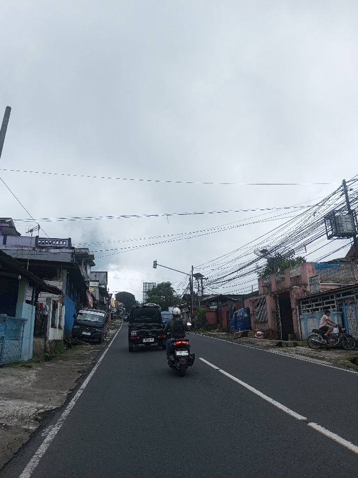 The image depicts an overcast street scene in what is identified as Ariyalai East, Sri Lanka. A two-lane asphalt road, marked with a solid white line separating directions, recedes into the distance under a uniformly grey, cloudy sky. Densely strung black utility cables traverse the upper frame, supported by multiple utility poles visible on both sides of the road. On the left, a narrow, uneven concrete sidewalk borders a row of multi-story buildings, some appearing aged or weathered. A dark-colored small utility truck or pickup is parked partially on this sidewalk, facing away from the camera, its front end appearing low. On the right, another row of buildings lines the street, including a prominent pinkish-brown structure featuring decorative elements on its facade. A complex network of utility wires and equipment is mounted on poles above these structures. Further down the street, a traffic light signal is visible. A person wearing a light-colored shirt is seated stationary on a classic-style motorcycle, facing left, positioned near the curb on the right side. Vehicular traffic moves away from the camera in the center of the road. A dark-colored utility truck with Indonesian license plate "D 9345 NJ" proceeds forward. Following it is a black scooter, ridden by a person wearing a light helmet and dark jacket, also moving away from the camera. This scooter displays an Indonesian license plate "P 6914 NM".