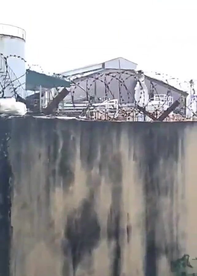 n electrical substation. The camera initially points up at a concrete wall topped with barbed wire, and then pans up to reveal electrical transformers and other equipment. The video ends with a shot of a large metal building with electrical insulators and conductors attached to its side.
