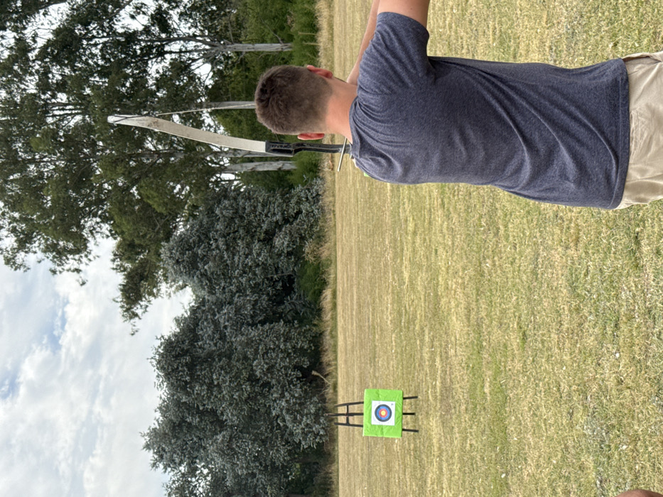 - "A person wearing a gray t-shirt and tan pants is shown drawing back a bow and arrow aimed at a green and blue target in a grassy field" by FM-uidZr2, licensed under CC BY 4.0