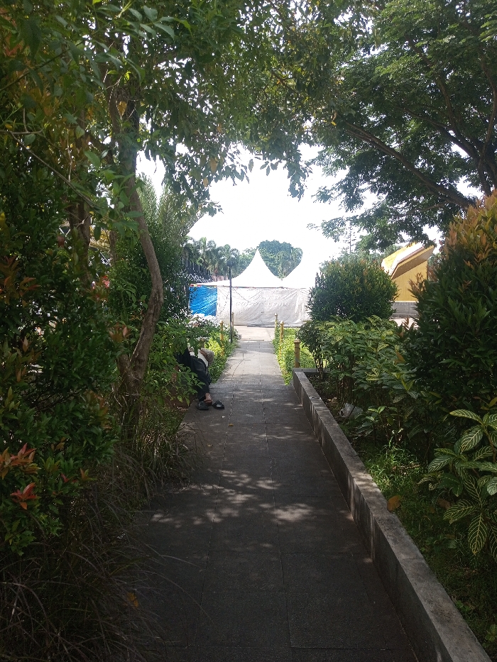 A tree-lined walkway leads toward a white tent structure in the distance. Lush greenery flanks either side of the path, creating a natural tunnel effect. A person is resting or sleeping beside the path on the left. The walkway is paved with dark gray stone, dappled with sunlight and shadows from the trees above. A yellow building can be seen to the right of the tent.
