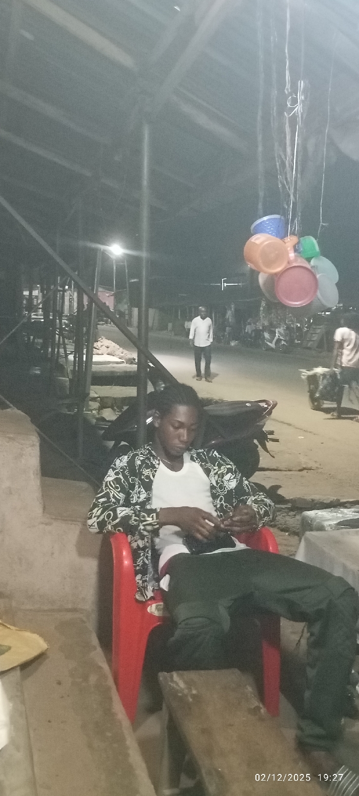 A man with dreadlocks sits in a red plastic chair wearing a white t-shirt and patterned shirt. He is looking at something in his hands. Behind him is a street scene at night, illuminated by streetlights. Another man stands in the middle of the road. To the right, hanging plastic cups are displayed. A motorcycle is parked in the background. The date "02/12/2025 19:27" is visible in the bottom right corner of the image.