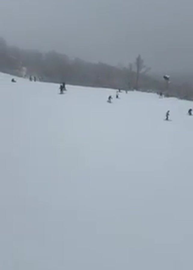 snowy hillside with several people skiing and snowboarding down it. The weather is overcast and foggy. The trees bordering the hill are covered in snow. A skier in a blue jacket and red pants is visible in the foreground. Other skiers and snowboarders are spread across the slope. One person is sitting on the snow.