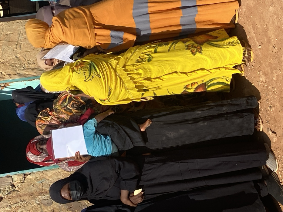 This image depicts a group of approximately eight individuals, predominantly women and one child, gathered outdoors in Omdurman, Sudan