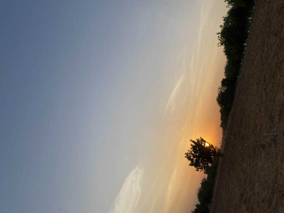 A vibrant sunset paints the sky in hues of orange and pale blue. A silhouette of a tree stands out against the bright sun, which is partially obscured. A field of brown dirt stretches out to the right side of the frame, while a line of trees follows its edge. Wispy clouds add texture to the colorful sky. The image is oriented sideways, with the horizon appearing vertical.