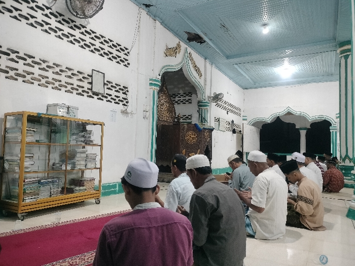 This image displays the interior of a mosque in Tumpeun, Indonesia, during a religious gathering