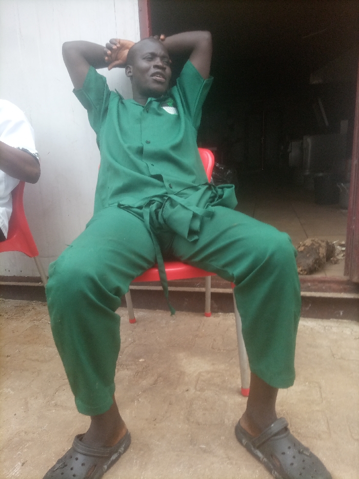 A man in green scrubs and black Crocs sits on a red plastic chair with his hands behind his head