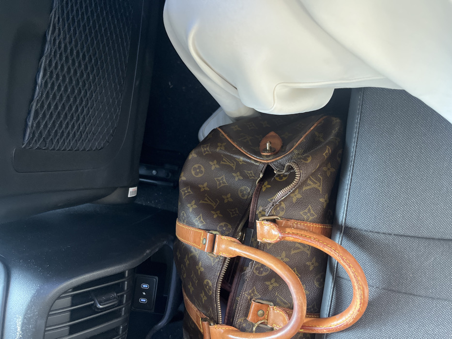 - "A Louis Vuitton duffel bag is nestled between the back seat and the center console of a car" by FM-si6Al2, licensed under CC BY 4.0
