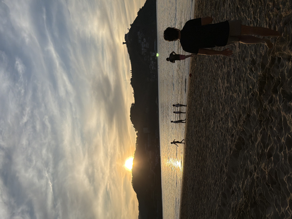 The image depicts a sunset over the Bay of La Concha in San Sebastián, Spain, observed from its sandy beach. The camera is positioned low, facing west or northwest. The horizon features two silhouetted hills: Monte Igueldo to the right, topped by a visible castle-like tower structure and smaller buildings along its slopes, and another hill to the left, behind which the sun is setting, emitting a bright golden glow that reflects across the calm water of the bay. The sky above displays cirrus and stratocumulus clouds, illuminated with golden-orange tones near the horizon, fading into lighter blue and grey hues overhead. On the sandy beach, six human figures are present, mostly in silhouette. In the immediate foreground, positioned on the right, a male figure walks barefoot towards the water, viewed from behind. He wears a dark t-shirt and light-colored shorts. Further into the mid-ground, near the water on the right, another male figure is partially submerged in the water, facing away from the camera, dressed in dark shorts and a pink shirt. A reddish-brown object, consistent with a football or rugby ball, lies on the wet sand to the left of this figure. To the left of the ball, a group of four additional figures, appearing to be children or young adults, stand at the water's edge. One figure on the far left of this group is in motion, walking towards the right, while the other three stand relatively still. The foreground sand exhibits textural variations and footprints.