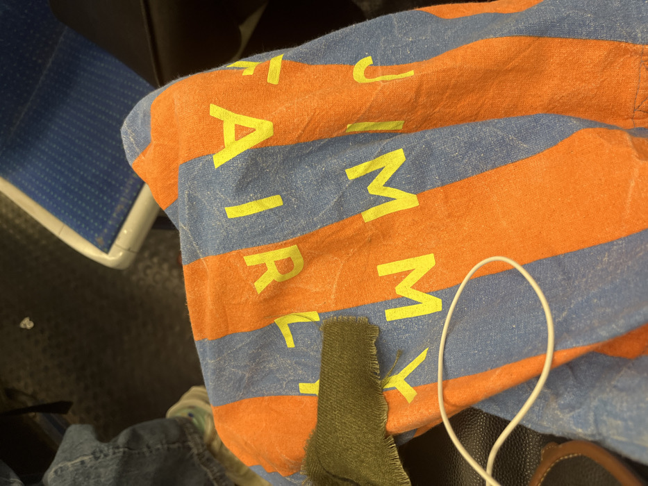 The image displays an interior scene from a public transport vehicle, likely a train or metro in Paris, France. A folded towel with alternating blue and orange vertical stripes dominates the central and right portions of the frame. The brand name "JIMMY FAIRLY" is printed in yellow capital letters on the towel, oriented upside down relative to the viewer. A dark olive green fabric swatch with a frayed edge is visible on the left side of the towel, and a white coiled cable rests on the lower left. In the background on the left, a person's leg wearing blue jeans and a light-colored shoe is visible on a dark, textured floor. On the right, a portion of a blue public transport seat with a white frame and a dotted texture is observable.