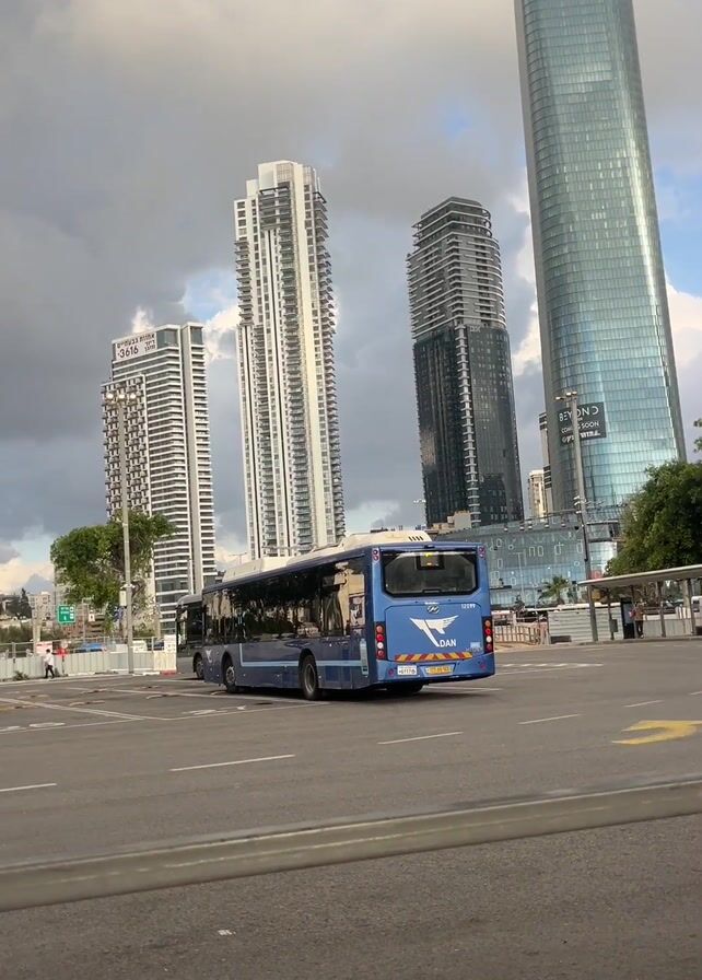 city scene with several buses and tall buildings in the background. The initial shot features a blue bus with "DAN" written on it moving away from the camera. The camera then pans to reveal a parking area filled with several buses of varying colors, including blue, green, and white, all lined up against the backdrop of skyscrapers under a cloudy sky. The video concludes with a blue and white "CNG BUS" driving by the camera.