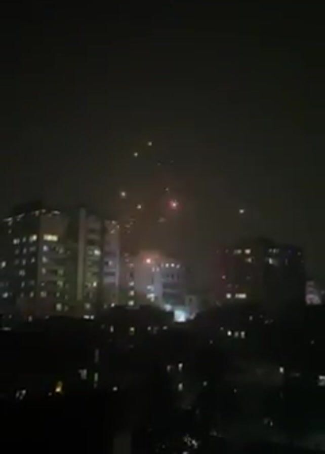 nighttime urban scene with fireworks. Several mid-rise buildings are visible in the foreground, silhouetted against the night sky. A cluster of fireworks is exploding above the buildings, creating a burst of light with various colors including red and gold. The fireworks illuminate the scene. The overall environment appears hazy or smoky.