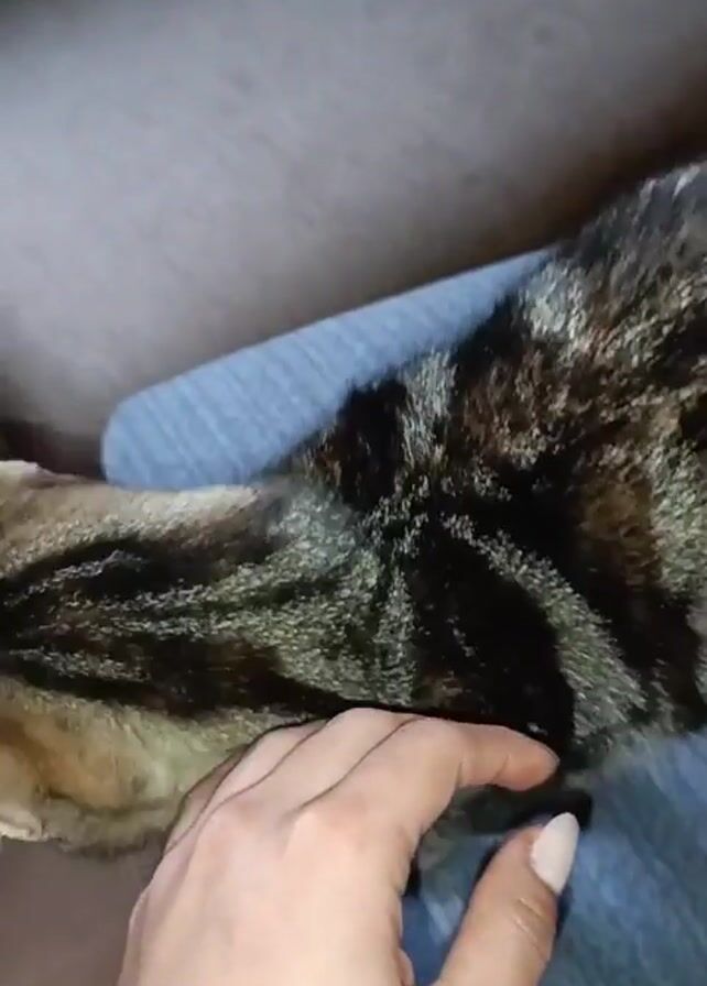 Here’s a description of the video: A hand gently strokes a brown tabby cat sitting on someone's lap