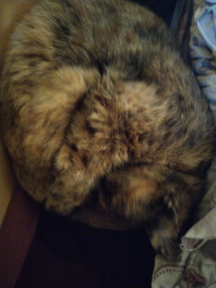 - "A tortoiseshell cat is deeply curled up, nestled on a surface beside a maroon-colored vertical panel, and what appears to be a patterned fabric" by FM-CNZ8C3, licensed under CC BY 4.0