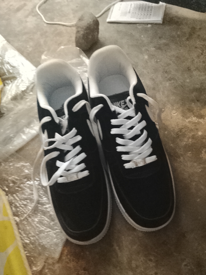 - "A pair of black Nike low-top sneakers, featuring white laces, white soles, and silver-toned "AF1" lace dubraes, are positioned side-by-side on a light brown concrete or tiled floor" by FM-o5Fdx2, licensed under CC BY 4.0