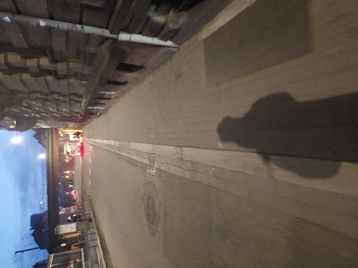 The image depicts an urban street scene in Strasbourg, France, during twilight or early night. The viewpoint is from a low perspective, with the elongated shadow of a person, likely the photographer, cast from a light source behind, dominating the lower right quadrant of the frame. The scene features a paved asphalt roadway extending into the distance, marked by a single white painted line separating it from a narrow, textured curb or median strip. To the right of this strip is a paved concrete sidewalk running parallel to a multi-story building with a distinct, block-patterned stone facade. A vertical conduit or pole is affixed to the building's facade on the far right. On the road surface in the foreground, a circular manhole cover and a rectangular grate are visible. In the mid-ground, an elevated concrete bridge or overpass spans the street. Beneath the bridge, a white tram or bus, displaying active red taillights, is observed moving away from the viewer. Multiple indistinct human figures are sparsely distributed along the street, particularly near the tram/bus and adjacent to a metal railing on the left side. Illuminated streetlights are visible, and the sky above is a deep blue, characteristic of the time of day.