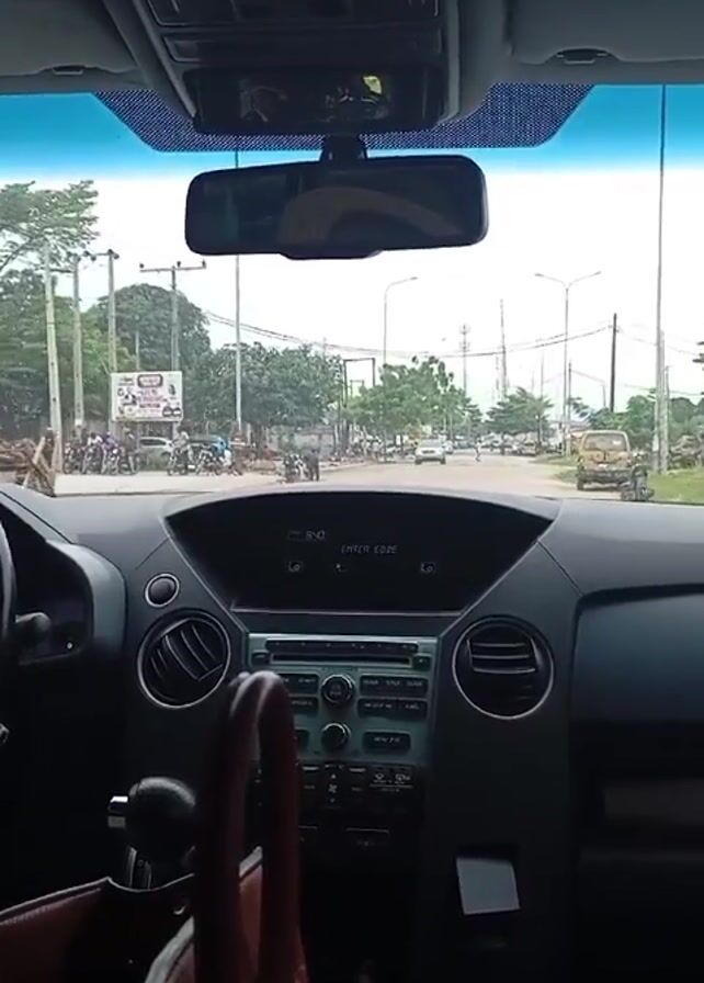 view from inside a car, looking out through the windshield. The car is stopped at an intersection with other vehicles and pedestrians visible. The dashboard is visible, including the radio display which reads "ENTER CODE." A brown bag hangs from the gear shift. The environment outside the car appears to be a street in an urban area with utility poles and streetlights. The overall impression is that the driver is waiting at an intersection.
