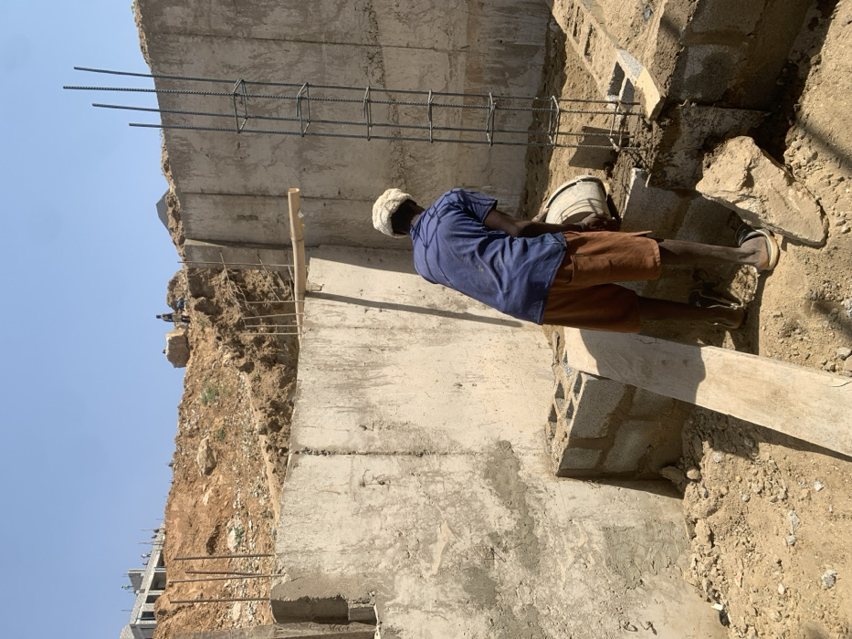 The image captures an active construction site in Abuja, Nigeria, under a clear blue sky