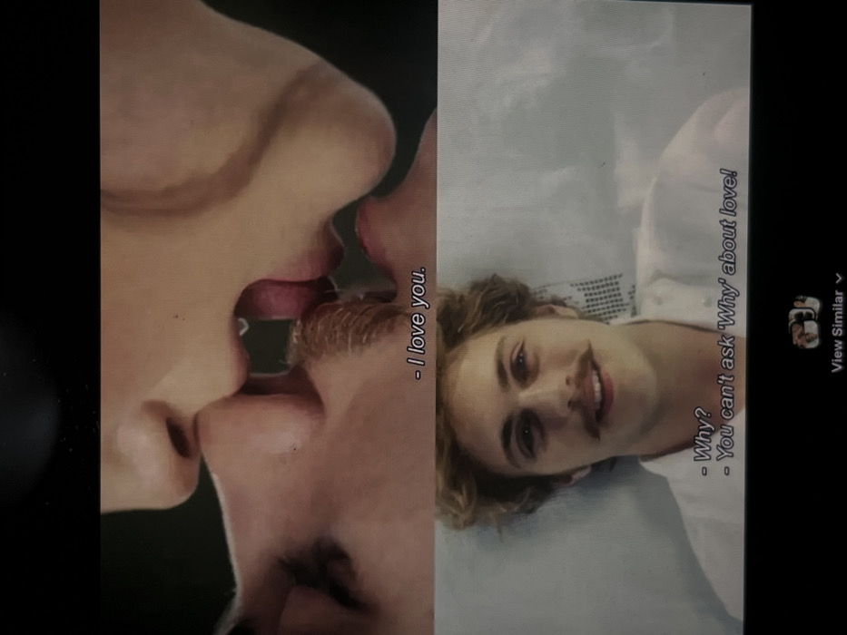 The image depicts two scenes. On the left, two people are in a close-up of a kiss, with the text "- I love you" superimposed. On the right, a person with light skin and wavy hair lies down smiling with the text "Why? - You can't ask 'Why' about love!" next to their face. A “view similar” option from social media is visible in the lower right corner of the image.
