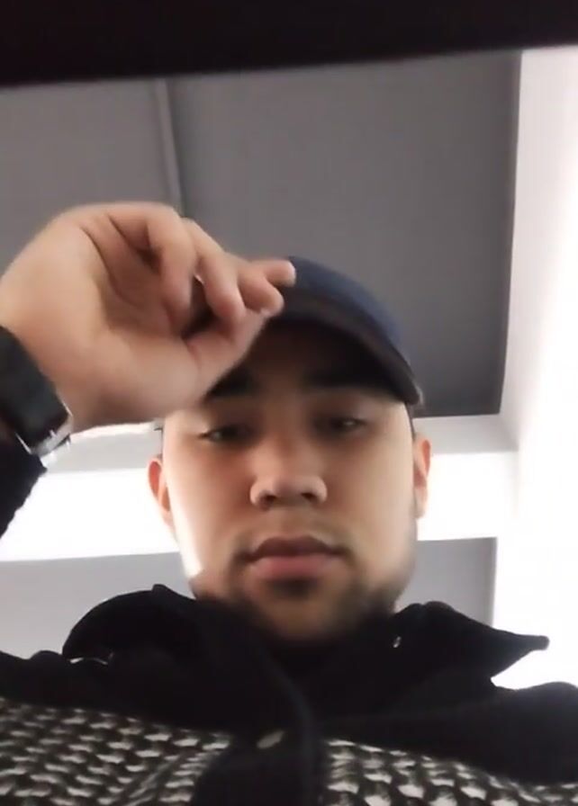 A close-up shot from a low angle shows a young man wearing a black baseball cap and a black and white patterned jacket. He is looking directly at the camera. His hand briefly touches the brim of his cap. The background is a gray ceiling.