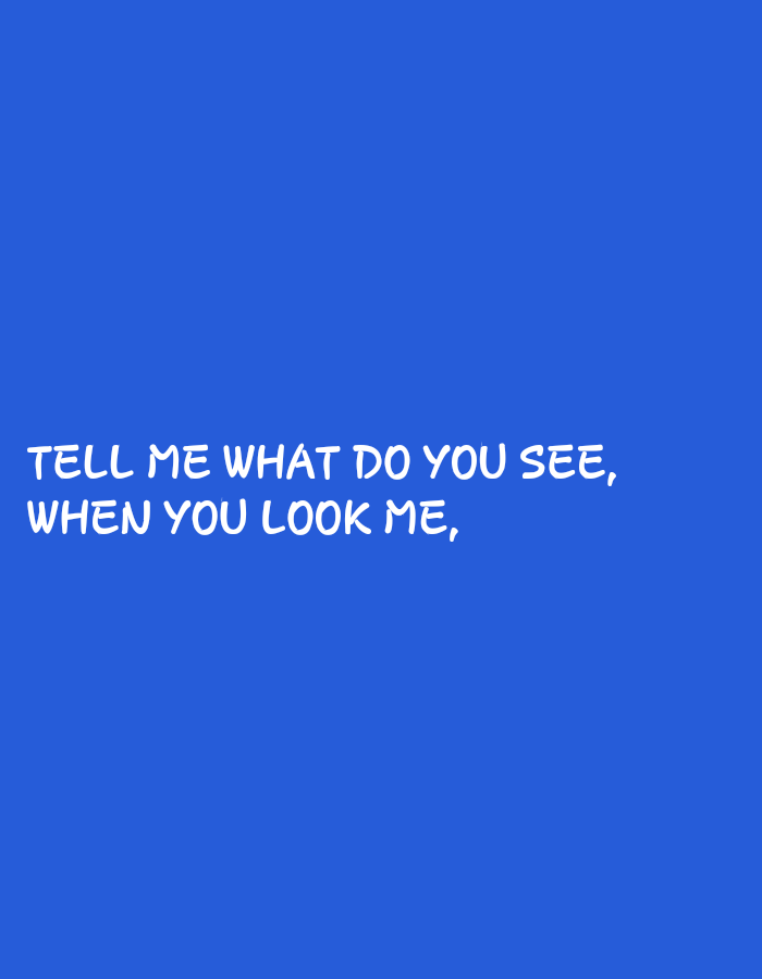 - "The image is a solid blue background with white text in a handwritten style that reads, "TELL ME WHAT DO YOU SEE, WHEN YOU LOOK ME" by FM-Km19n1, licensed under CC BY 4.0