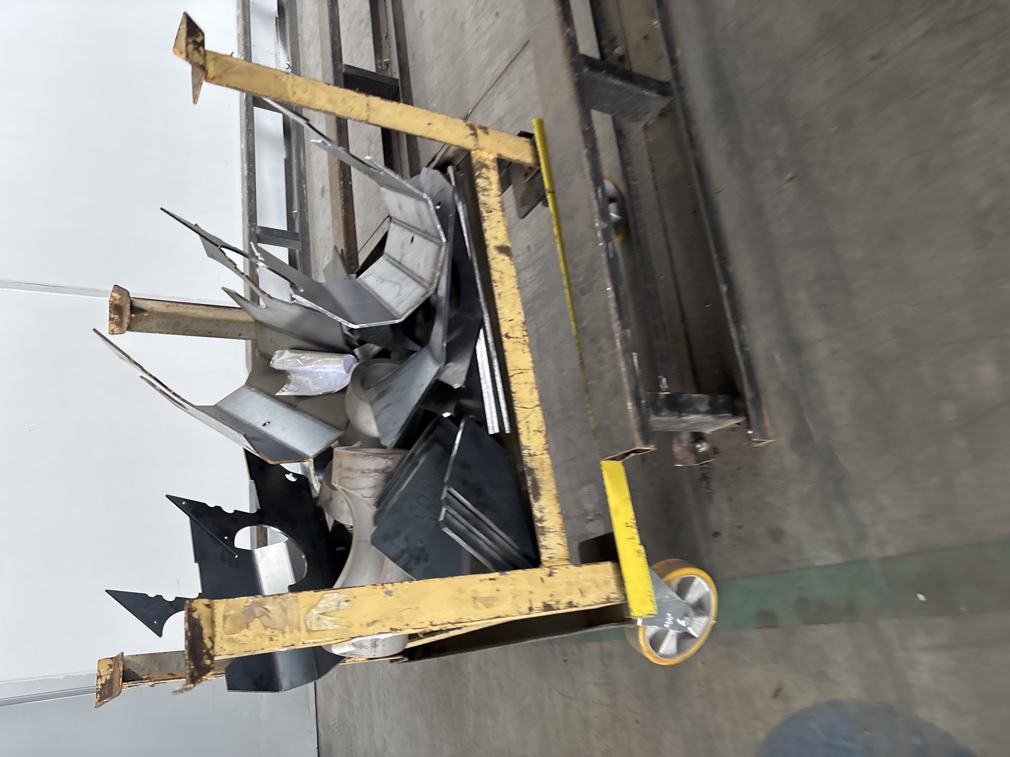 yellow metal cart, likely a shop cart, loaded with metal scraps of various shapes and sizes