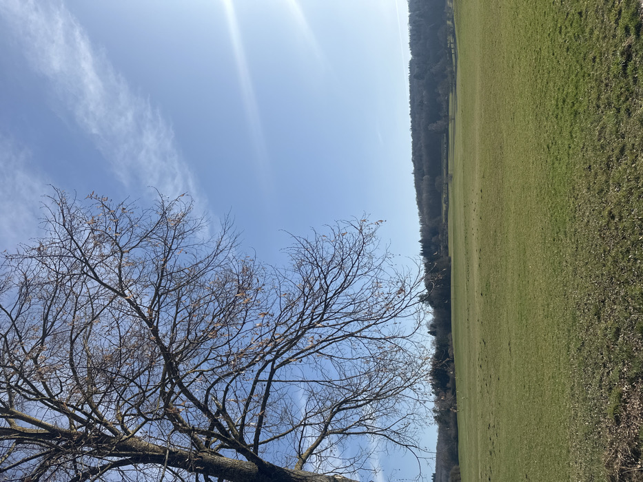The image depicts a rural landscape within Weißenburg in Bayern, Germany, on a clear, sunny day. The left foreground is dominated by the trunk and bare, leafless branches of a large deciduous tree, from which some dried seed pods or catkins are visible. The midground consists of an expansive, undulating green grassy field. In the background, a dense line of forest stretches horizontally, appearing on a gentle rise or hill. The sky is bright blue with scattered, wispy white cirrus clouds, and a distinct sun glare is present in the upper right quadrant of the frame. No human figures or discernible structures are present.