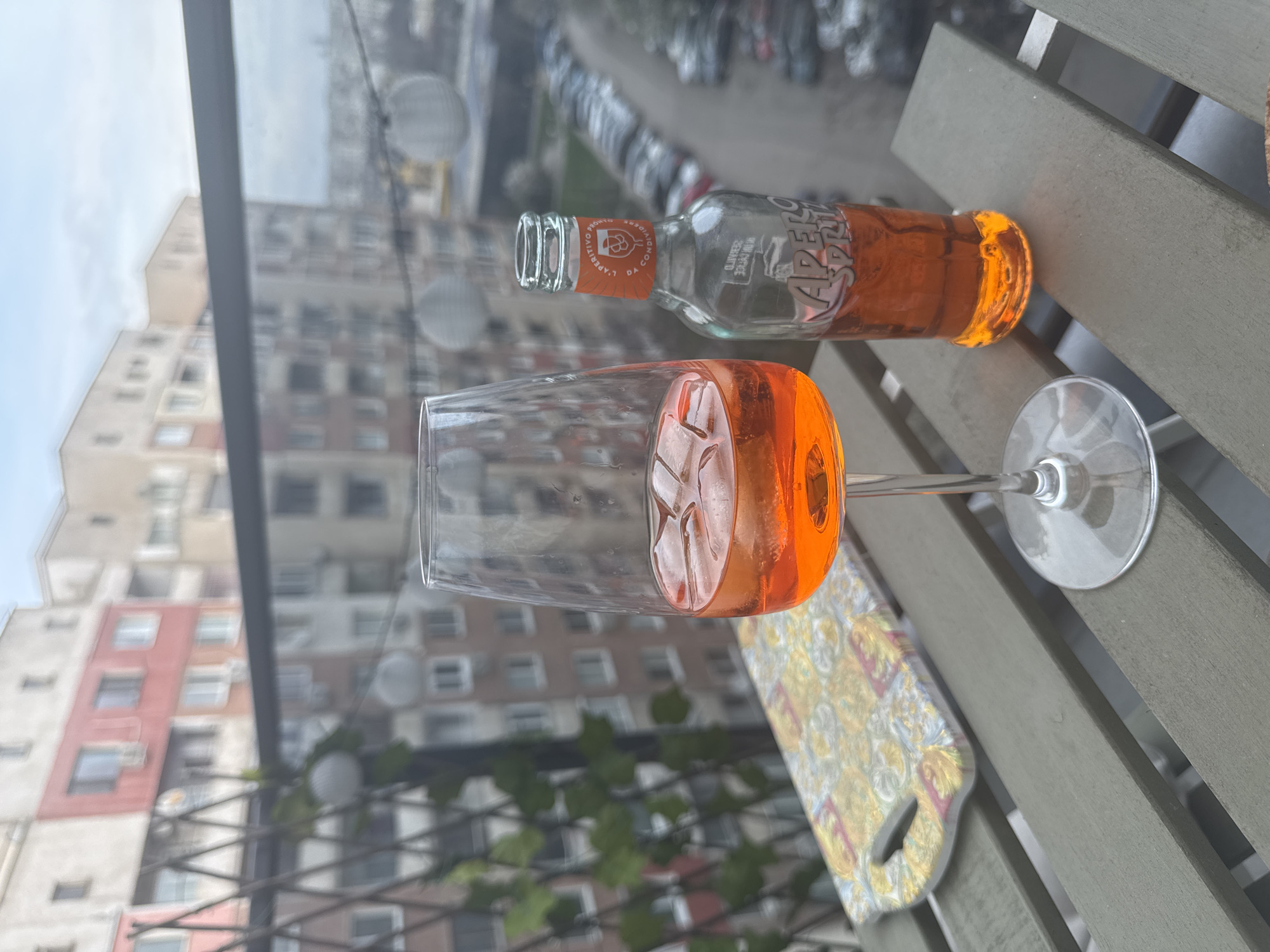 wine glass filled with a bright orange liquid and ice cubes, alongside a small glass bottle also containing the same orange liquid, resting on a gray wooden surface. A decorative, patterned object is also visible near the base of the glass. The background shows an urban scene with apartment buildings and a parking lot. Based on the architectural style and the general appearance of the cityscape, the location is likely in Sofia, Bulgaria.