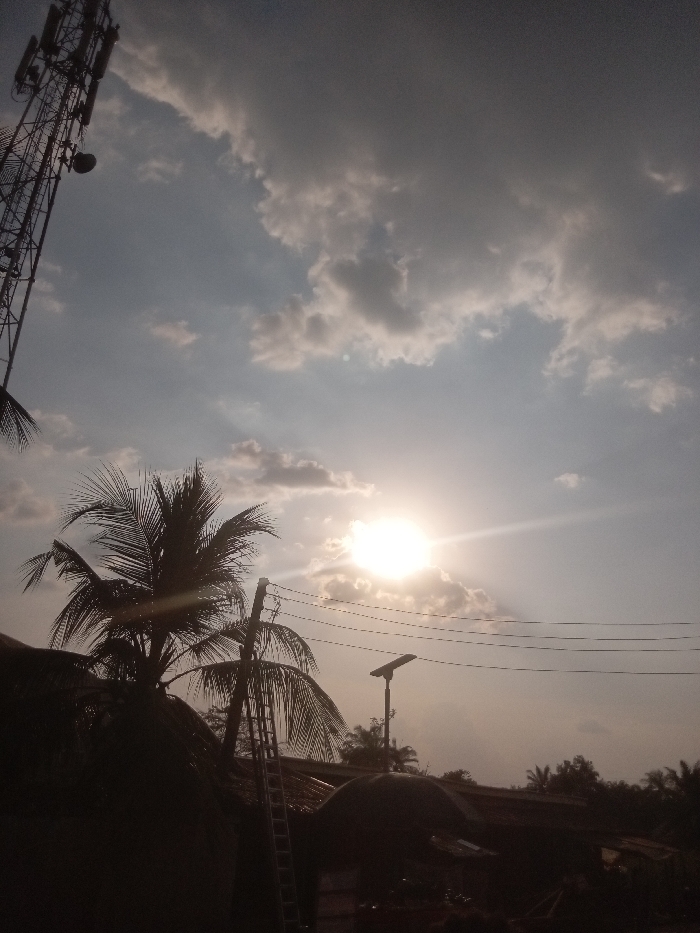 This image depicts an outdoor scene in Igbenu, Nigeria, characterized by conditions consistent with either sunrise or sunset. The sky, partially cloudy, displays a gradient from light blue in the upper left to a brighter, hazy hue around the sun. A prominent, bright sun is positioned in the central-right portion of the frame, emitting a significant lens flare and discernible light rays. In the upper left, a portion of a tall, metallic, lattice-structured communication tower is visible, extending vertically out of the frame. The midground features the dark silhouettes of several palm trees, with one large palm tree centrally located. Adjacent to this palm tree, a silver-colored ladder leans against a dark vertical pole or tree trunk. Multiple dark, horizontal utility lines traverse the mid-frame from left to right. To the right, a slender, dark pole supports a flat-panel, solar-powered light fixture at its apex. The lower foreground consists of dark, indistinct silhouettes of rooftops and additional dense foliage, indicating a built environment with surrounding vegetation. No individuals are present, and no active interactions or specific actions are discernible within the frame.