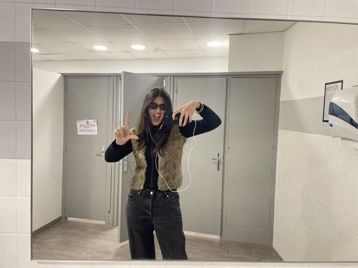 The image captures a mirror selfie of a young woman in what appears to be a public restroom or facility at Lycée Joffre in Montpellier, France. **Subject:** A female individual with long, dark hair, dark sunglasses, a black turtleneck sweater, a light brown faux fur vest, and dark high-waisted jeans. She is wearing white wired earphones. Her mouth is open in a wide smile, and she holds a dark-colored smartphone in her right hand, pointed towards the mirror, indicating she is taking the photo. Her left hand is raised, forming an "L" shape with her thumb and index finger. A silver bracelet is visible on her left wrist. **Environment:** The background consists of light grey walls with white rectangular tiles on the lower half. The floor is a light grey surface. Two light grey doors are visible; the one on the left is closed and features a white sign with a red border. This sign displays a "No Smoking" symbol and French text, including "DÉFENSU DE FUMER" and specifically identifying the location as "ACADÉMIE DE MONTPELLIER - Lycée Joffre". To the right, on the tiled wall, a white and blue paper towel dispenser is mounted, with a black-framed document positioned above it. The ceiling is composed of white square acoustic tiles with integrated recessed lighting fixtures. The overall lighting is bright and artificial. **Location:** The specific location is identified as Lycée Joffre, a high school in Montpellier, France, based on the text visible on the sign affixed to the left door.