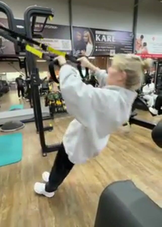 A woman is shown using a black and yellow suspension training system in a gym. She’s wearing a light gray sweatshirt, black pants, and white athletic shoes. Her blonde hair is up in a bun. She pulls herself up repeatedly, leaning backwards into the exercise. The gym has various machines, a wooden floor, and other people working out in the background. A blue yoga mat rests on the floor nearby. There is an advertisement poster on the wall that says “KARE.”