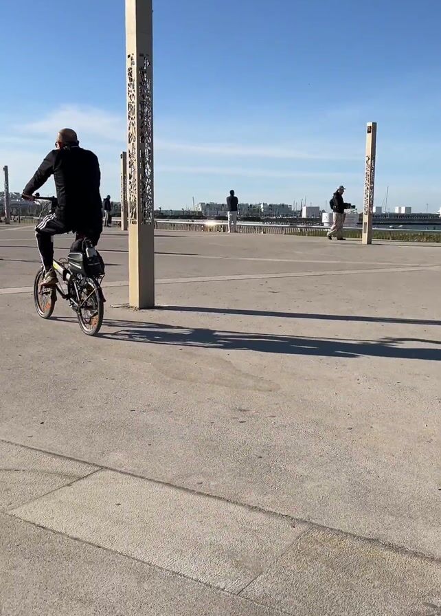 The scene shows two people riding foldable bikes on a sunny day in an outdoor public space. The first person, dressed in black athletic attire with white stripes on their pants, is riding away from the camera. The second person, wearing a light-colored jacket and a baseball cap, is seen holding their arms out to the sides as they navigate their bike. They are riding in the same direction as the first person, with several other pedestrians walking in the background. The area features modern light fixtures and a paved surface with rectangular tiles. The background reveals a cityscape with buildings and what appears to be a port area with ships. The sky is clear and blue.