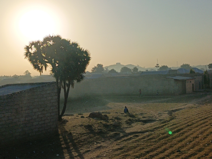 A rural landscape bathed in early morning light. A tall, palm-like tree stands to the left of the frame, casting long shadows. A simple brick building is partially visible. In the distance, a hazy wall surrounds several smaller structures. A few figures dot the landscape. The foreground features rows of plants, indicating agricultural activity. The overall scene evokes a sense of quiet and rural life.