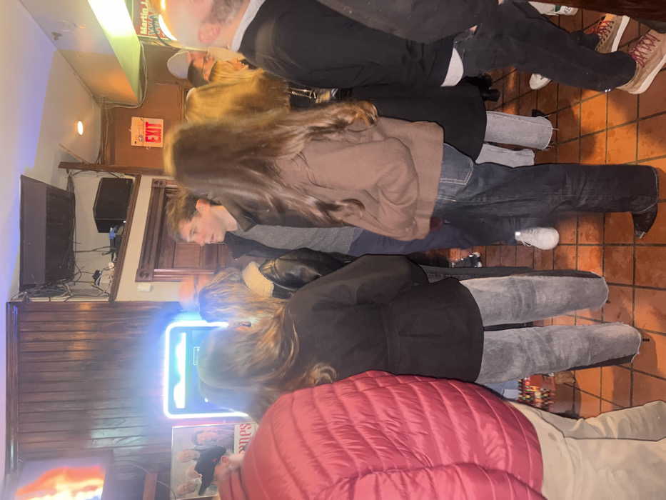 A group of people stand close together in a warmly lit, tiled-floor room. Various clothing styles are visible, including jackets, jeans, and sneakers. An "EXIT" sign hangs near a doorway. A television sits on a shelf, with various wires exposed. A brightly illuminated jukebox or similar device stands out.