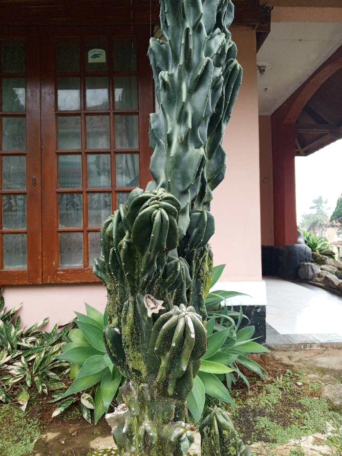 A tall, gnarled cactus stands in a garden bed. It has multiple arms, some with a darker green hue and mossy texture, and one with a dried flower attached. Green-leafed plants surround the base. Behind it, a house facade is visible with a multi-paned window and a covered porch area. The ground is covered in scattered grass and earth.
