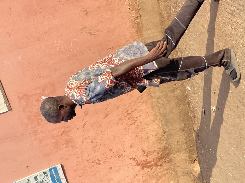 An adult male is captured in profile, walking from right to left across an outdoor scene in Samaru, Nigeria