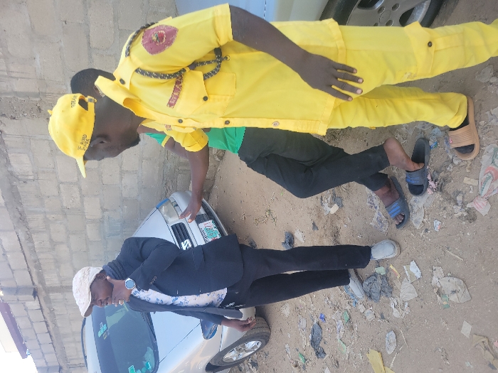 This image, taken in the city of Bauchi, Nigeria, depicts three adult males engaged in an interaction on an unpaved, debris-strewn dirt path. A silver four-door sedan, identified by its visible front end and license plate "BAU 220 YJ" with a green sticker on the windshield, is parked on the left, serving as a background element. A concrete block wall forms the backdrop, with a thin red line visible near its top edge. On the left, a man wears a light-colored flat cap, a dark blazer over a light patterned shirt, dark trousers, and light slip-on shoes. He has a watch on his left wrist and holds his right hand near his chin, appearing to be speaking or contemplating, while looking towards the right. To the right, a man in a bright yellow short-sleeved uniform, comprising a shirt with epaulets (a red circular patch on the left one) and a black rectangular patch on the chest pocket, and matching yellow cargo-style trousers. He wears a yellow baseball cap with visible text "BEHIND DIVER" and "COSMAN". He wears light brown slip-on sandals. His left arm is extended forward, palm facing the man in the blazer, in a gesture of emphasis or pushing back, as he looks towards the man on the left. A black shoulder cord hangs from his left shoulder. Between these two men, a third individual is partially obscured, wearing a green t-shirt, dark trousers, and blue and black slip-on sandals, with one foot partially out of a sandal. The ground beneath the individuals is visibly littered with plastic bags, paper, and various other forms of trash. The scene is illuminated by bright daylight.