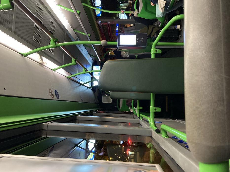 The interior of a bus is viewed from a low angle. Green handrails and seat backs are prominent. A ticket validation machine is mounted on a handrail. Overhead vents and lights are visible. Reflections of the outside environment are visible on the floor. Passengers are sitting in the seats.
