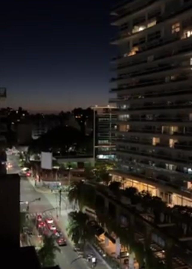 The camera shows a night cityscape, likely from a high vantage point like a balcony