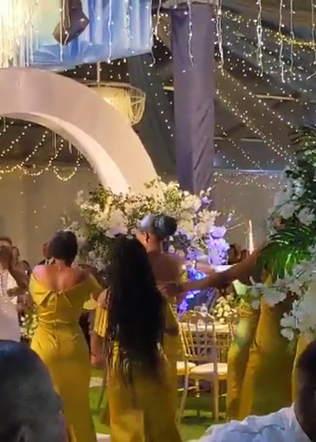 group of people at a wedding reception. In the foreground, people are dancing, and a child in a suit stands near a woman in a pink dress. Behind them, the bride, in a white dress, is dancing with several women in yellow dresses. There are white floral arrangements on either side of the dance floor. A large, white, arch-shaped structure stands behind the dance floor, and string lights hang from the ceiling. People are watching and taking pictures. A man is seen taking a video of the scene.
