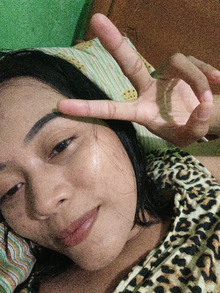 A young individual, appearing female, is depicted in a close-up, high-angle portrait, likely a selfie. The subject is lying down, with her head resting on a patterned pillow featuring green, yellow, and white stripes or abstract shapes. She has dark hair, dark eyes, and a slight smile, with her face exhibiting a degree of shine. Her right hand is raised in front of her forehead, forming a "peace" or "victory" sign with the index and middle fingers extended. She is wearing a garment with a leopard print pattern, visible on her right shoulder and chest. The background consists of a solid green surface to the upper left and a darker, possibly brown or wooden surface to the upper right. The image contains significant digital noise, characteristic of low-light photography. This scene is located in the city of Kecamatan Pati, Indonesia.