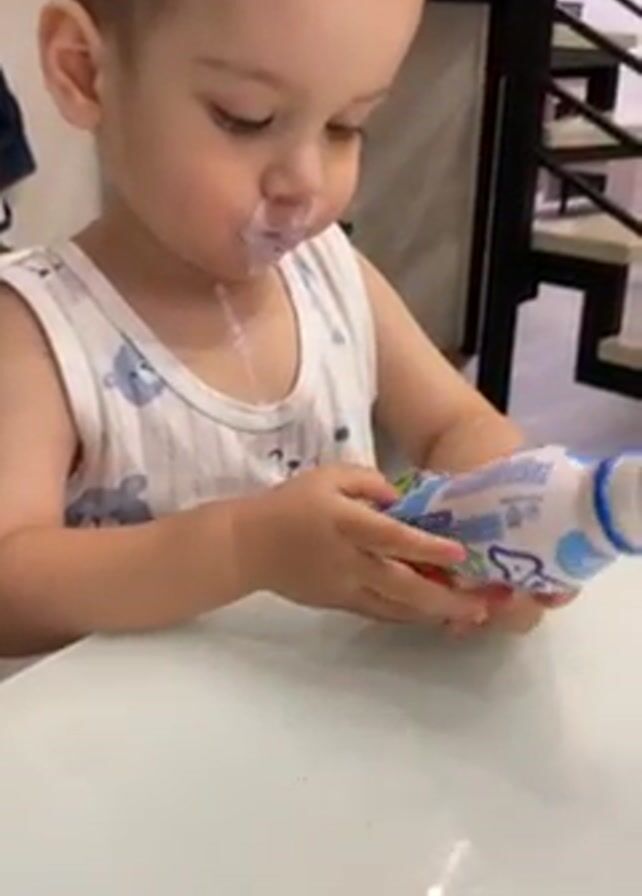 - "A toddler sits at a white table, holding a bottle of "Arzym" yogurt drink" by FM-NoKcg2, licensed under CC BY 4.0