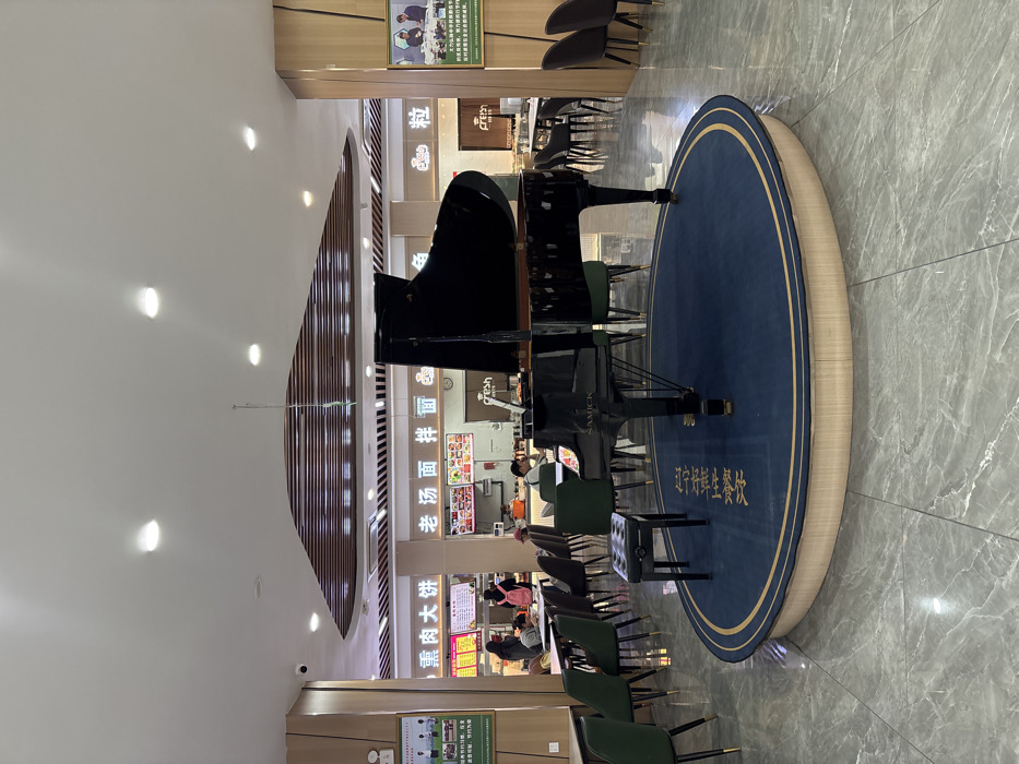 This image depicts the interior of a spacious dining area, identified as being located in Linghe, China. The central feature is a glossy black SAMICK grand piano situated on a circular, raised platform. This platform is covered with a dark blue carpet, detailed with a gold concentric border and Chinese characters inscribed in gold. A matching black piano stool rests in front of the instrument. Beyond the piano, the area transitions into a food court or cafeteria. Multiple food stalls are visible, indicated by overhead signs in Chinese reading "熏肉大饼" (Smoked Meat Pancakes) and "老汤面 拌面" (Old Broth Noodles, Mixed Noodles). Each stall features illuminated food display cases. Several individuals are present in the dining area. On the left side, approximately four people are seated at tables with dark green chairs, some appearing to be eating or conversing. One individual wears a pink backpack. Further into the background on the right, additional tables with dark gray chairs are visible, mostly unoccupied but indicating more seating capacity. The environment features light wood-paneled walls on the left and right, each displaying green informational posters with text and images. The ceiling is white, equipped with multiple recessed circular lights and a visible security camera on the left. Above the food stalls, a decorative, wave-like structure composed of horizontal wooden slats is integrated into the ceiling. The floor throughout the entire space is covered with light gray, marbled tiles. The overall lighting is bright and artificial.