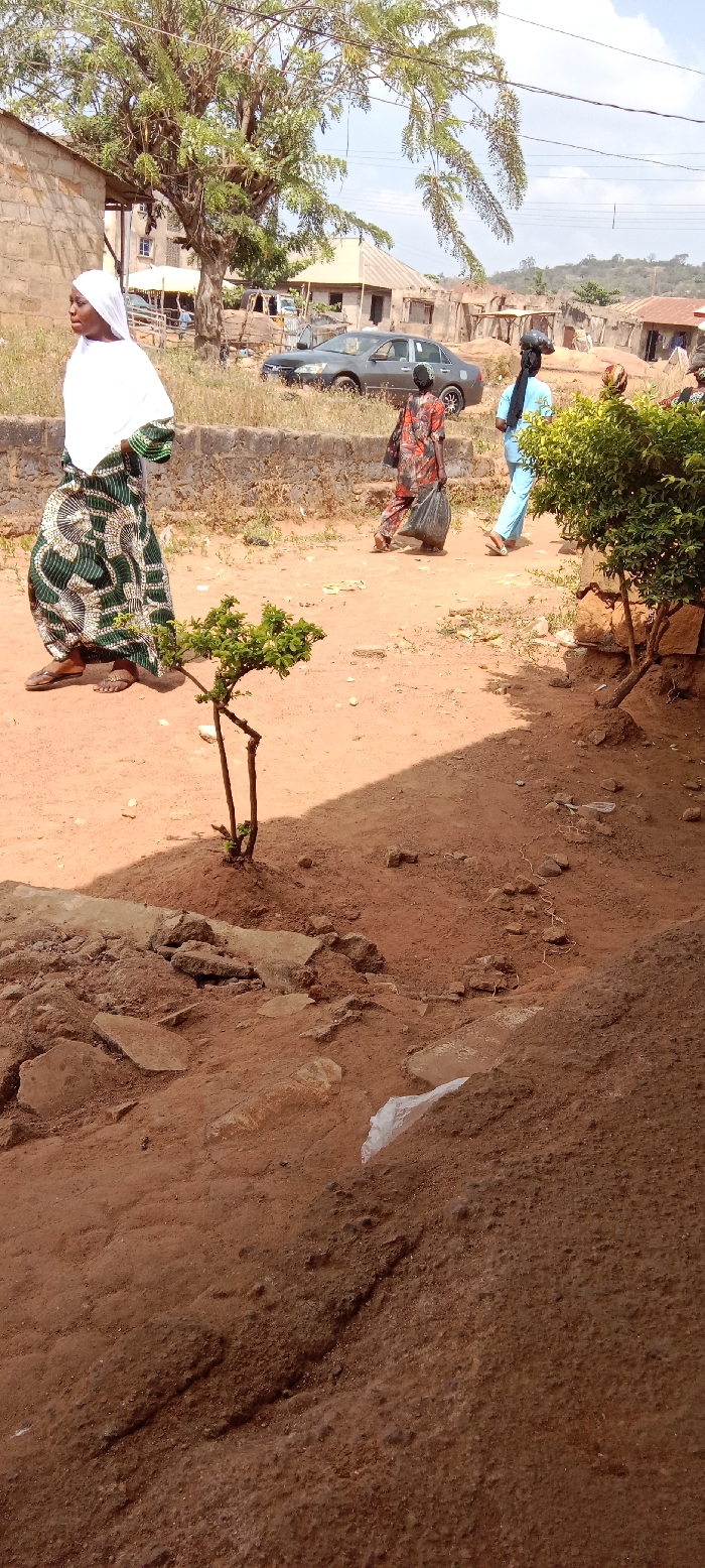 The image depicts an unpaved, reddish-brown dirt street scene in Egbedi, Nigeria, under bright daylight with strong shadows indicating sunlight from the upper right. In the foreground, a woman in a white headscarf and a green and white patterned long skirt walks from right to left. To her right, a small, leafy green shrub grows from the dusty ground, surrounded by scattered concrete rubble. Further into the midground, two women walk away from the viewer, moving from left to right. The first wears a reddish-brown patterned long garment and carries a black plastic bag in her left hand. The second wears light blue attire and carries an obscured object on her head. A low, light-colored stone or concrete wall separates the immediate foreground from a slightly elevated area where a dark-colored sedan is parked facing slightly left. Behind the car, another lighter-colored vehicle is partially visible. The background features several simple buildings, mostly single-story with unpainted concrete block walls and corrugated metal roofs, indicating a semi-developed residential or commercial area. A large, deciduous tree with green foliage dominates the background center, casting shadows. A distant hilly landscape is visible under a clear sky in the upper right. Overhead wires are faintly discernible. Debris, including a white plastic bag, is scattered on the ground in the foreground right.