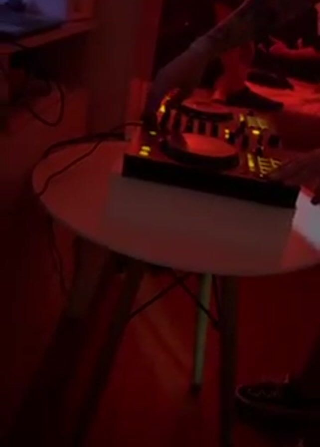 A person wearing black-and-white sneakers and with long hair operates a small DJ controller on a white round table with wooden legs. The scene is bathed in red light, indicating a party atmosphere. The table sits on a red floor, and a speaker and desk are visible to the left. Through a doorway, two people can be seen, with one leaning on a bed. The DJ is actively using the controller, indicating they are mixing music.