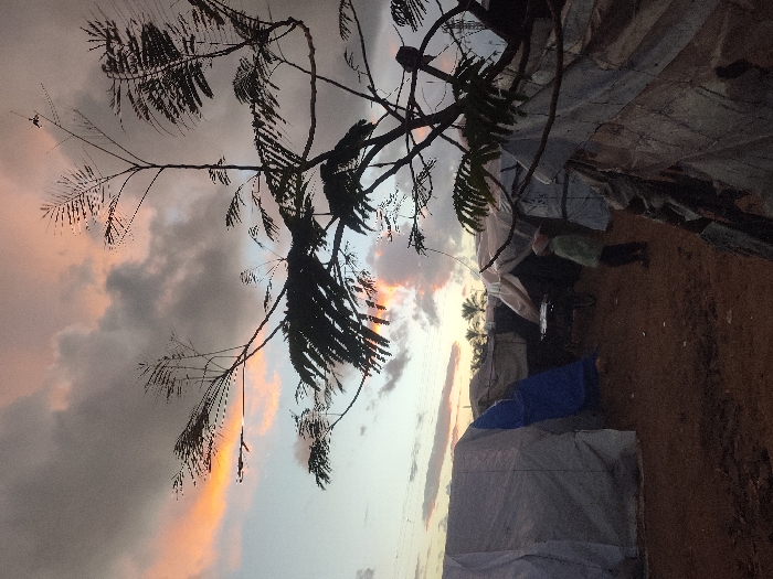The image depicts a makeshift encampment in Khan Yunis, Palestinian Territory, at dusk. The foreground features reddish-brown dirt. Multiple temporary shelters constructed from light-colored tarpaulins, with one distinct blue section, are visible across the left and middle ground. A lone individual, dressed in light-colored attire and a head covering, stands in the middle ground, facing away from the camera and towards the right, appearing to look at structures or objects beyond the frame. A bicycle is discernible between two shelters in the mid-ground. A large tree with dark, sparse foliage occupies the right side, extending diagonally across the frame and partially obscuring the view. The sky above is characterized by dark gray clouds interspersed with patches of orange and pink light from the setting sun, while a clearer blue horizon line is visible further in the background, silhouetting a line of palm trees.
